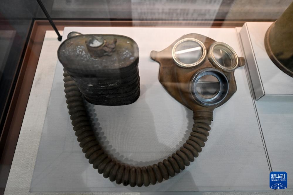 百团大战纪念馆展出的侵华日军使用的防毒面具(7月7日摄)。