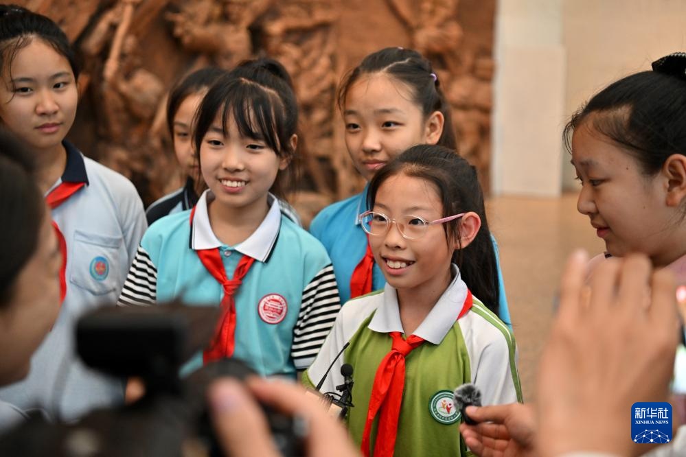 7月7日,在山西省阳泉市百团大战纪念馆,小朋友在接受采访。