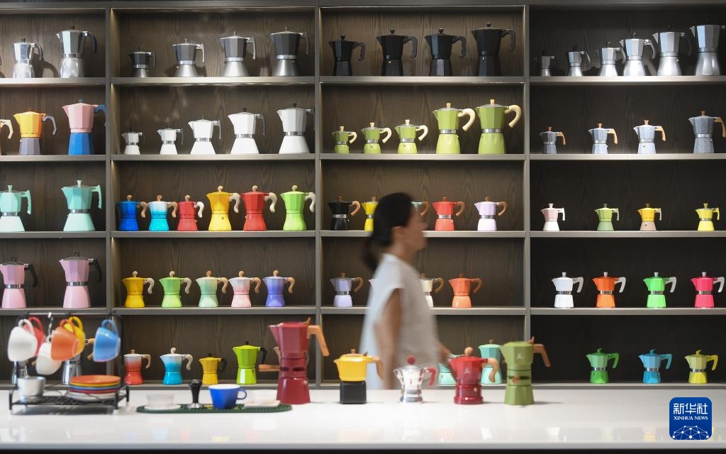 7月8日,在浙江创建厨具有限公司,工作人员走过摆放摩卡壶的展架。