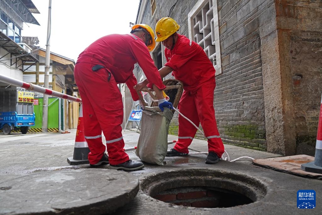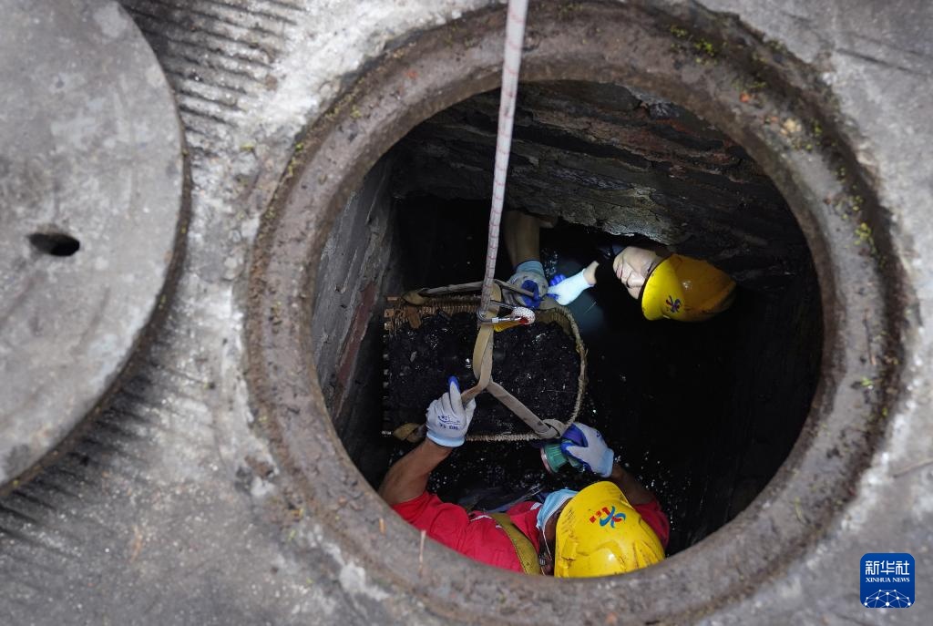 在赣州古城一条街巷,市政工作人员在对福寿沟管网进行清疏(6月18日摄)。