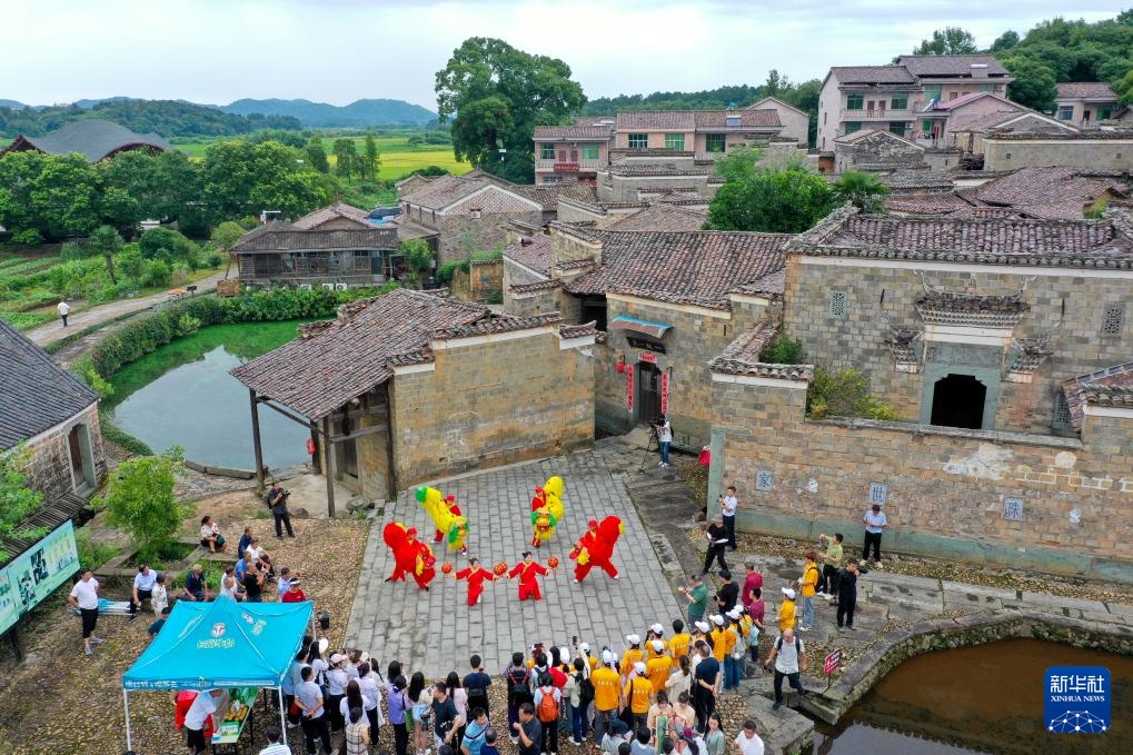 7月9日,游客在江西省抚州市金溪县竹桥村观看“手摇狮”表演(无人机照片)。
