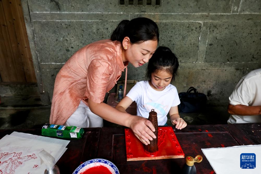 7月9日,一名小朋友在竹桥村苍岚山房体验雕版印刷技艺。苍岚山房曾是竹桥村学子读书的学堂,也是雕版印刷作坊。