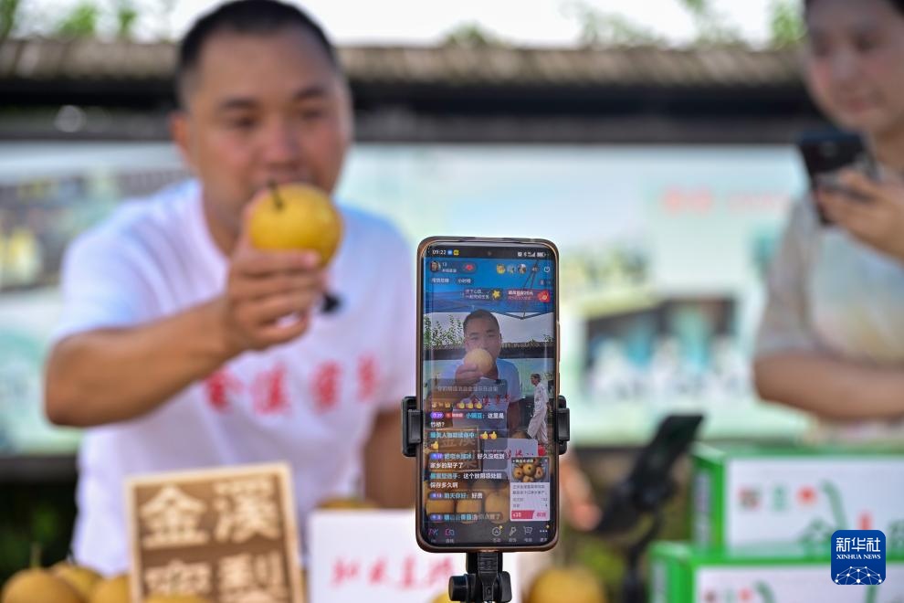 7月9日,金溪县自媒体主播在竹桥村通过网络直播助力当地特色水果“金溪蜜梨”销售。