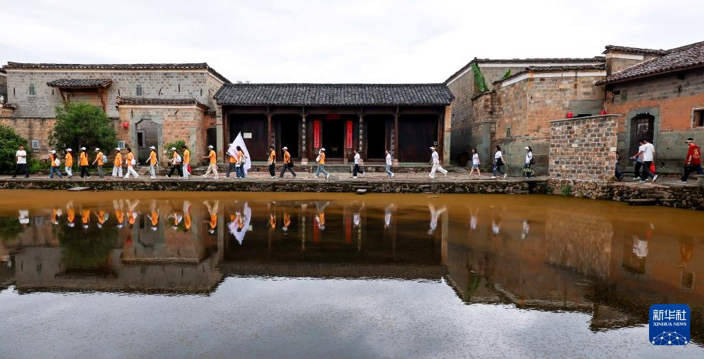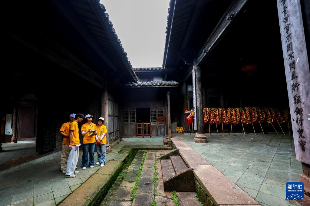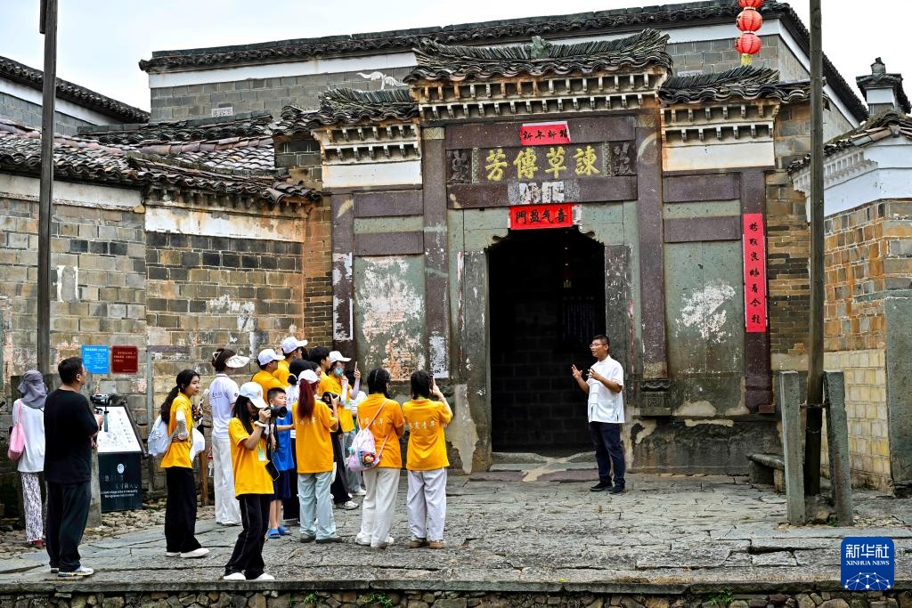 7月9日,在江西省抚州市金溪县竹桥村中门楼前,金溪县青田书院院长洪志文(右一)向来到金溪县开展暑期“三下乡”社会实践的荆楚理工学院和江西旅游商贸职业学院师生介绍竹桥村文化传承和古建保护等情况。