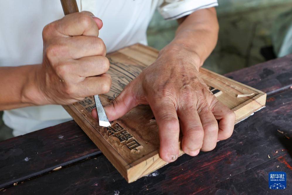 7月9日,一名工匠在竹桥村苍岚山房展示传统雕版印刷技艺。苍岚山房曾是竹桥村学子读书的学堂,也是雕版印刷作坊。