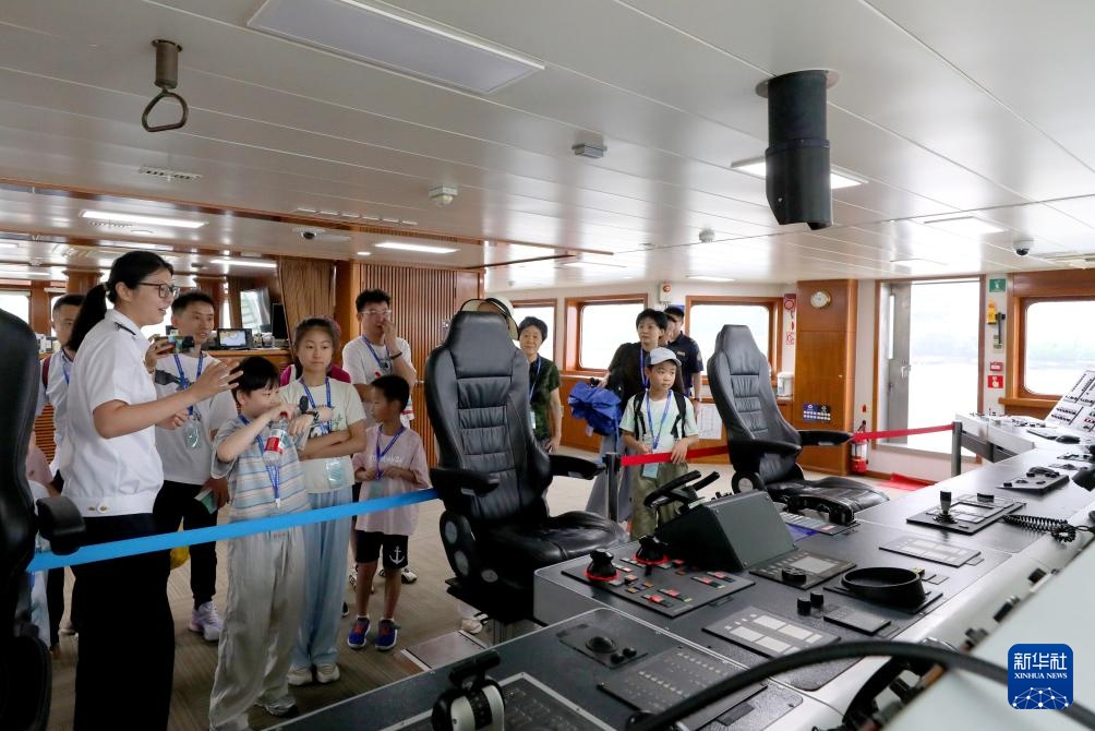 7月11日,工作人员(左)在“海巡01”轮驾驶室内为游人介绍该轮相关设备知识。