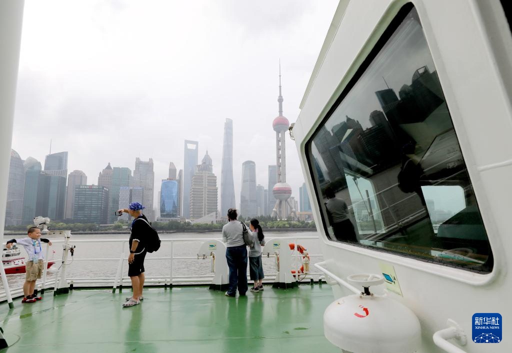 7月11日,游人在北外滩国际客运中心码头上布置的航海日主题装饰展板前拍照。