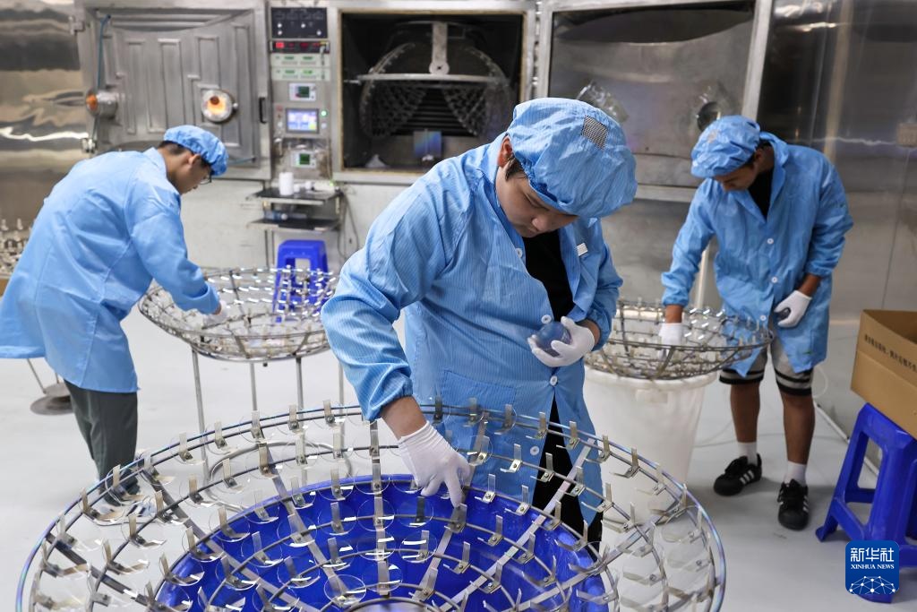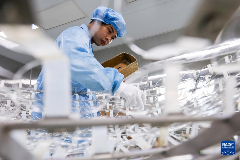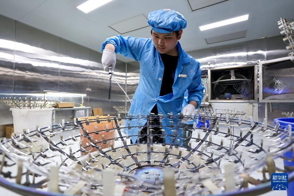 7月10日,在江西科强光学有限公司镀膜车间,工人将镜片放置在镀膜伞架中准备镀膜。