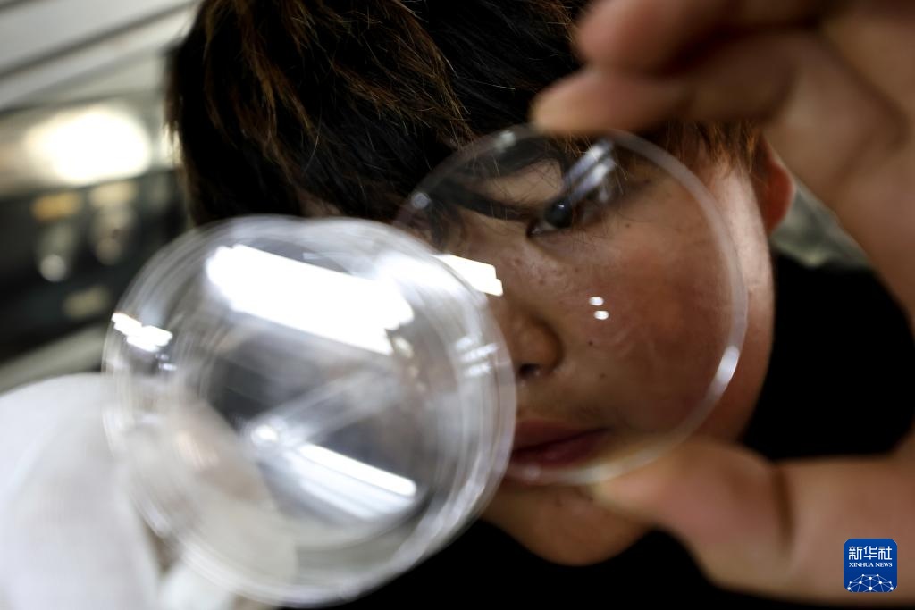 7月10日,在江西科强光学有限公司生产车间,工人在检验成品镜片。