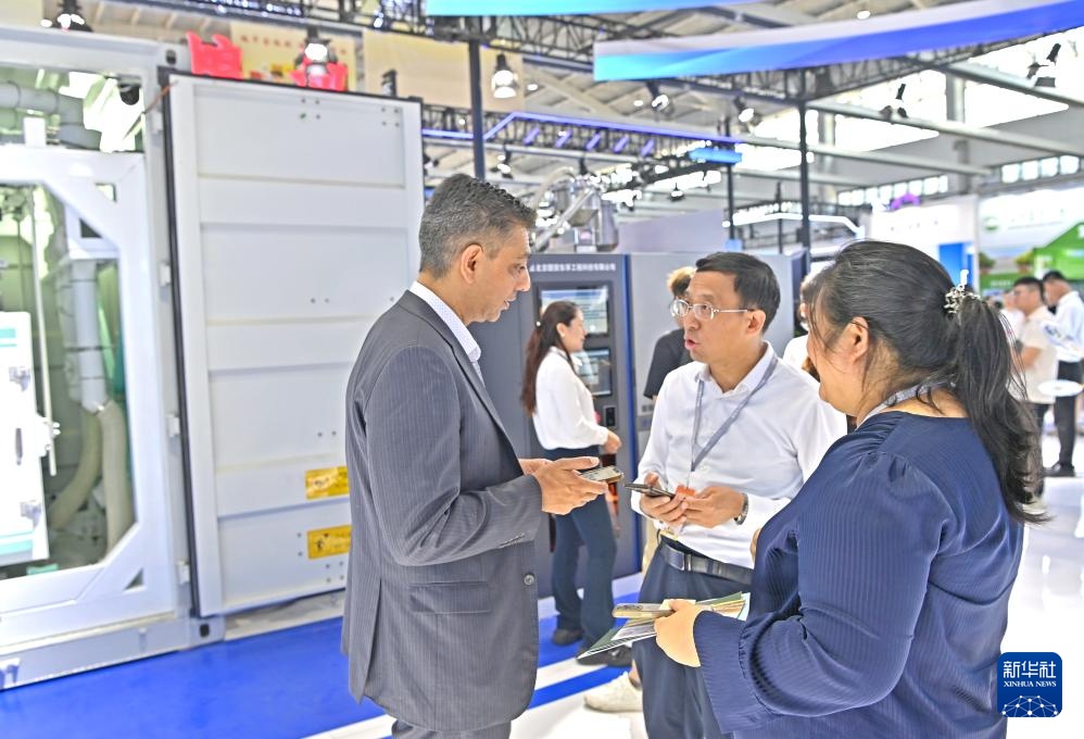 7月12日,国外客商在沈阳国际展览中心了解粮食加工机械。