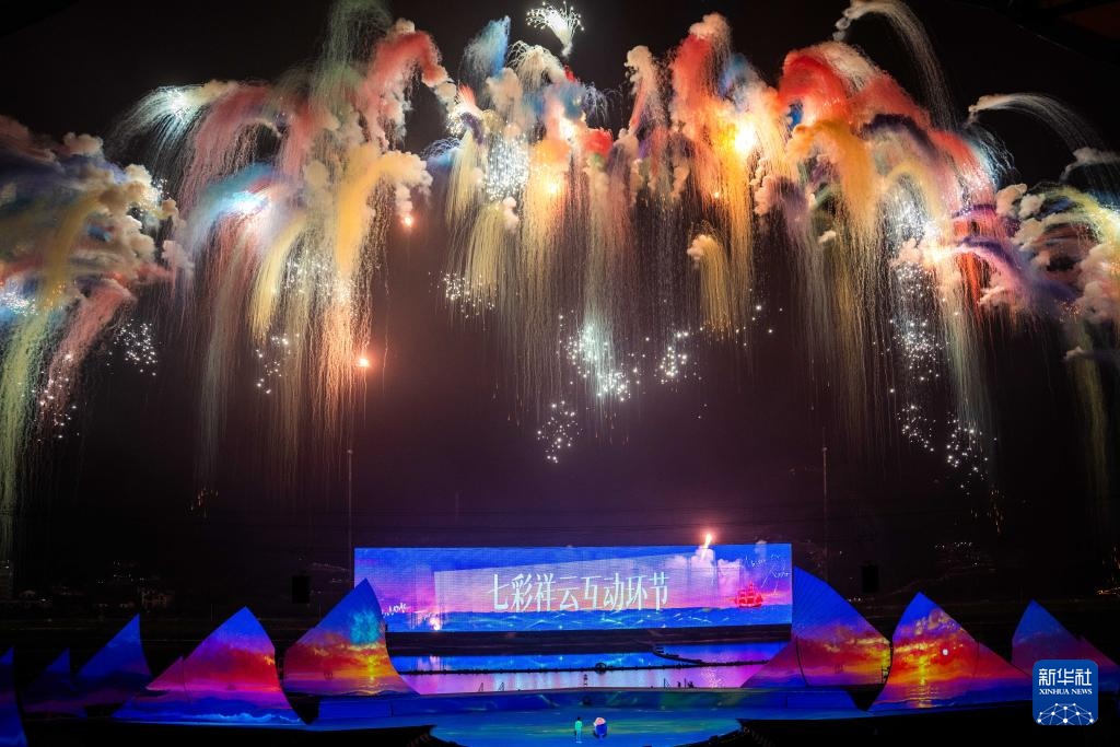 这是7月12日在湖南省浏阳市天空剧院拍摄的“焰遇浏阳河·仲夏花火夜”创意焰火秀。