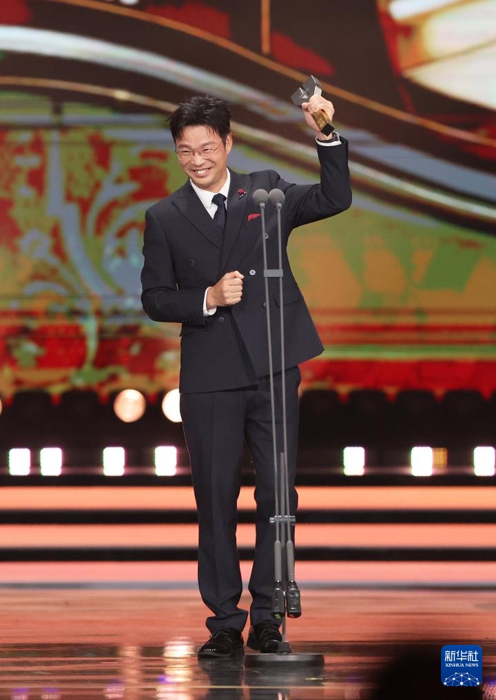 7月12日,获观众喜爱的喜剧电影男配角的王迅在闭幕式上致谢。