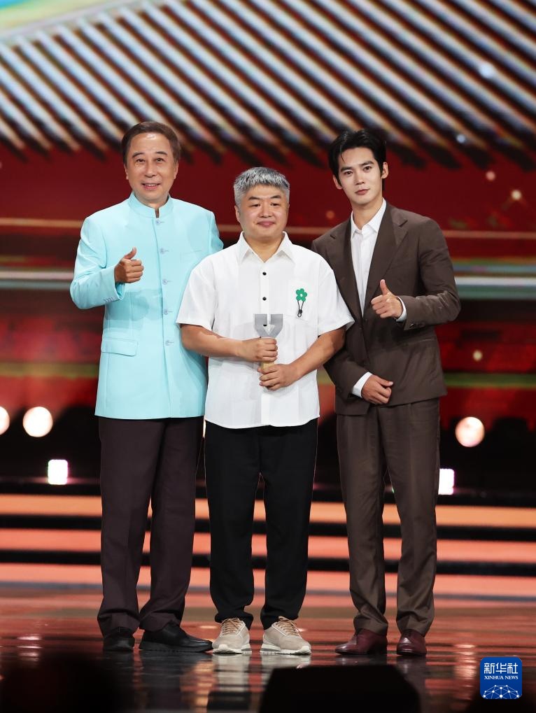 7月12日,演员冯巩(左)和于适(右)为获观众喜爱的喜剧电影《抓娃娃》的制片人马驰颁奖。