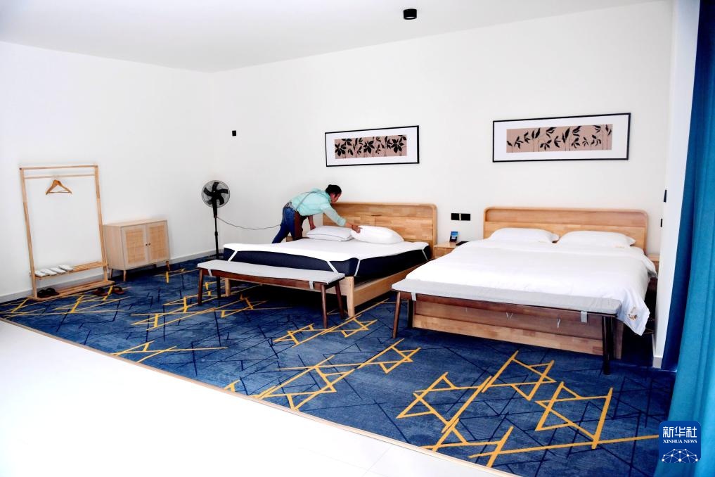 7月13日,工作人员在河北邢台内丘县侯家庄乡一处民宿整理床铺。