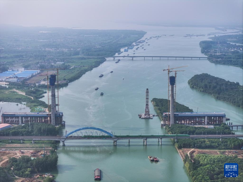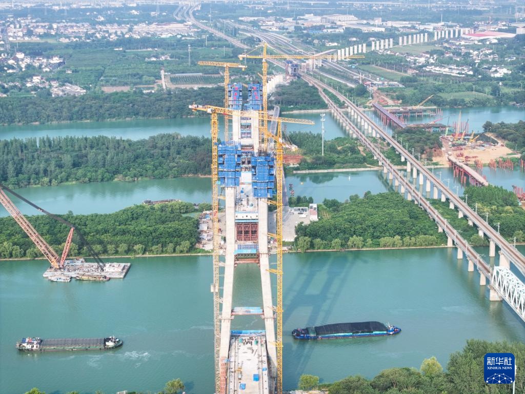 这是沪渝蓉高铁跨京杭运河斜拉桥施工现场(7月13日摄,无人机照片)。