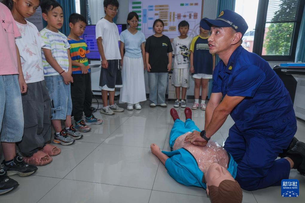 7月15日,在诸暨市安华镇社会治理中心,消防队员为孩子们讲解防溺水知识和急救技能。