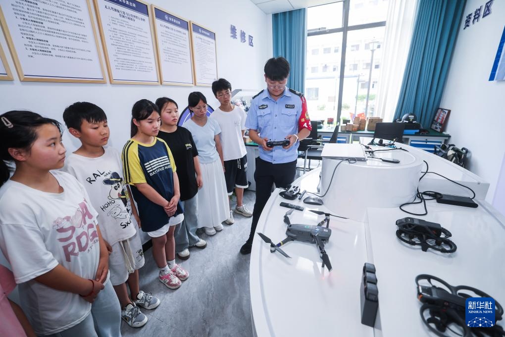 7月15日,在诸暨市安华镇社会治理中心,安华镇派出所辅警为孩子们讲解无人机的各项功能。