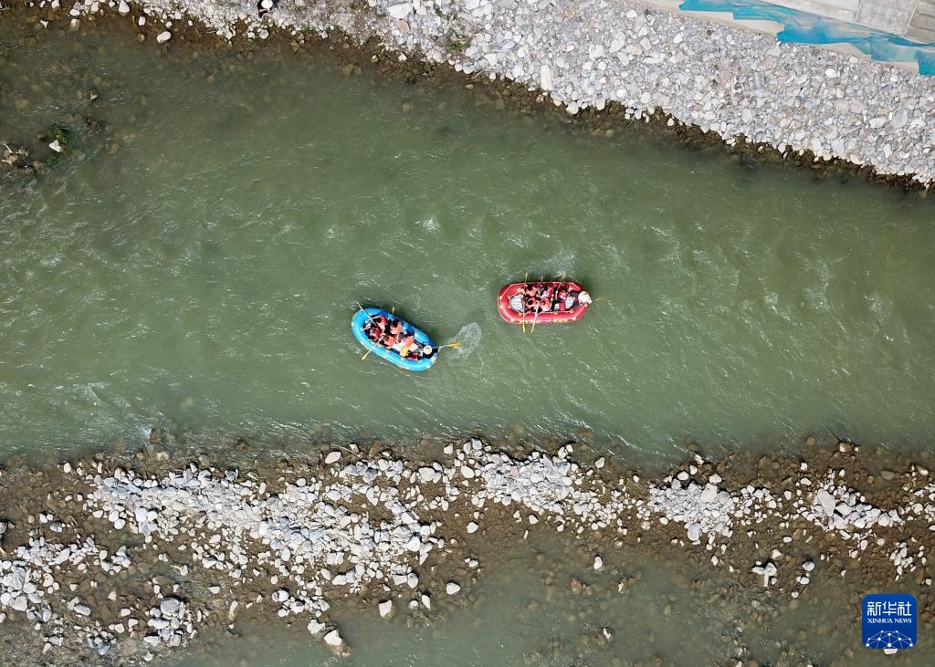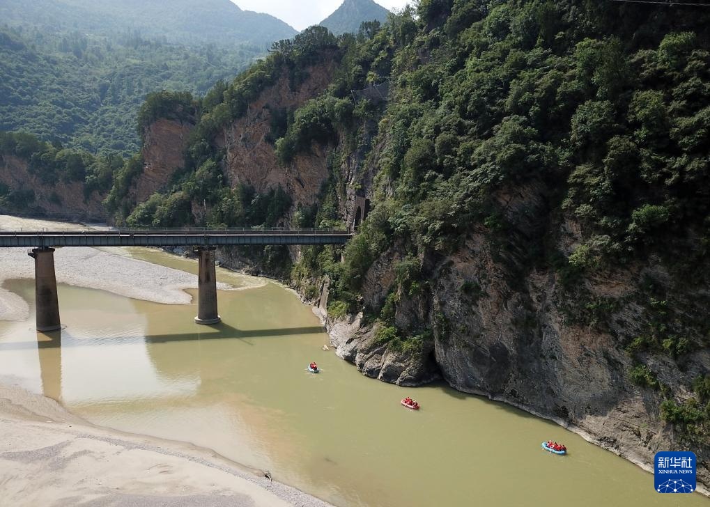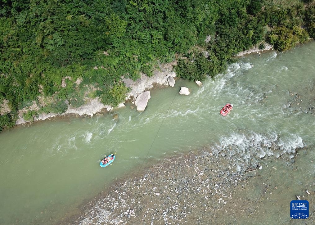 游客在徽县嘉陵江上体验漂流(7月15日摄,无人机照片)。