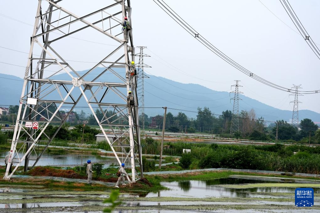 7月15日,安徽送变电工程有限公司带电作业班“00后”王庆闵(中)和同事攀爬上塔作业。