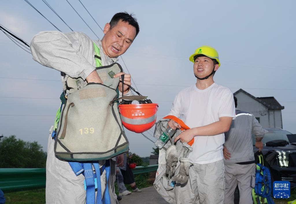 7月15日,安徽送变电工程有限公司带电作业班“00后”王庆闵(左)和师傅吴维国在进行上塔前的准备。