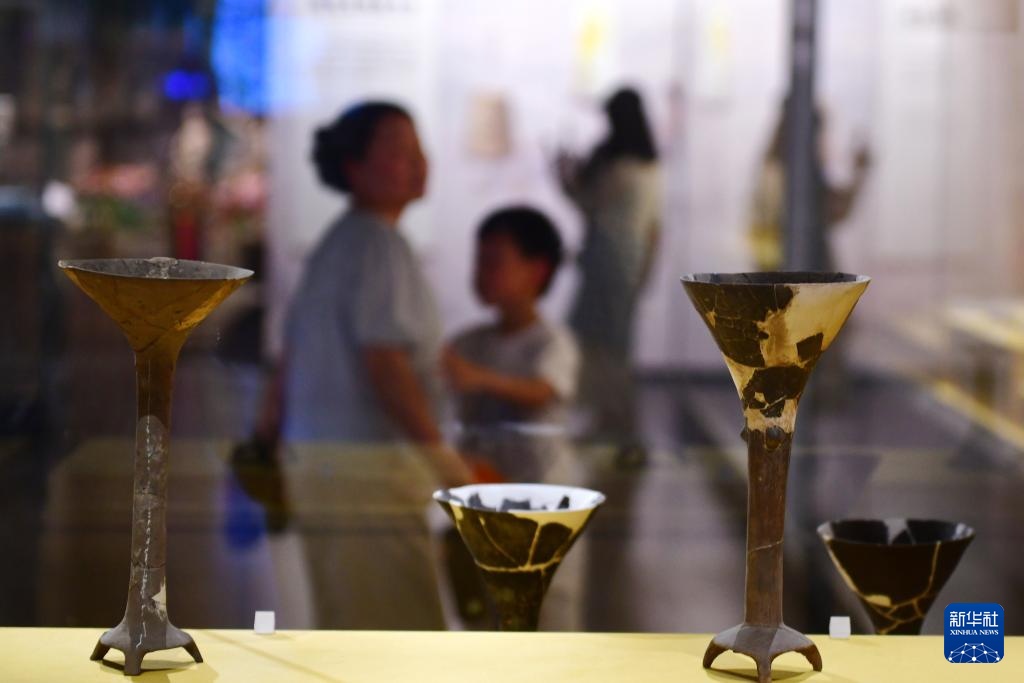 7月14日,游客在大汶口遗址博物馆内参观出土陶器。