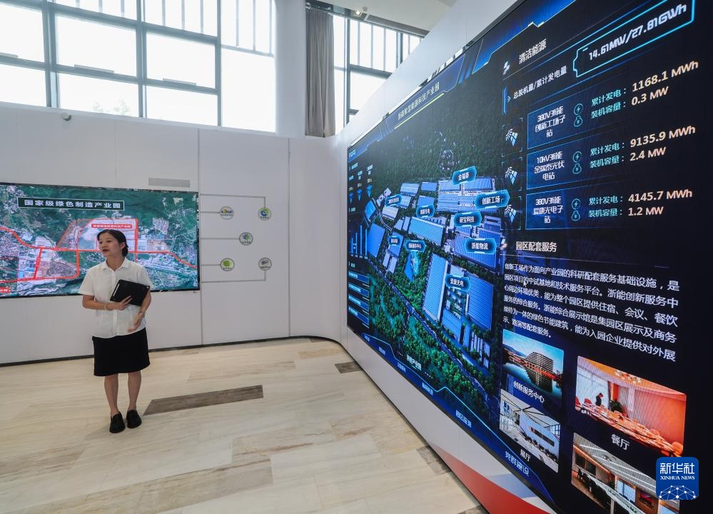 7月16日,浙能智慧能源科技产业园展厅的工作人员在介绍数字大屏的内容。