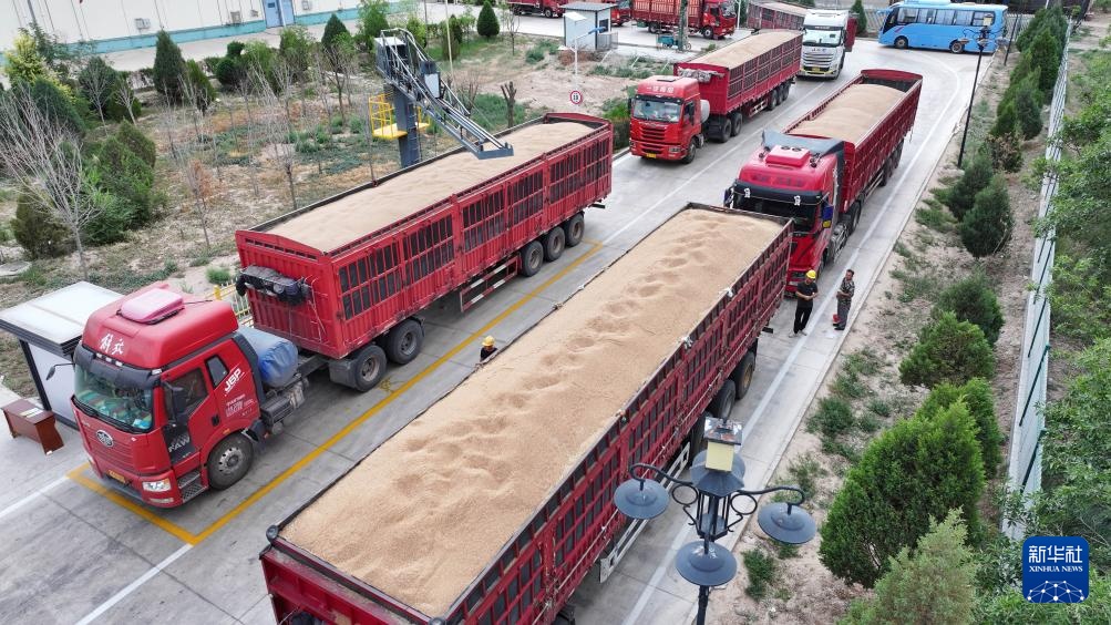 7月16日,交售粮食车辆在宁夏粮食集团银川滨河储备库排队交售粮食(无人机照片)。