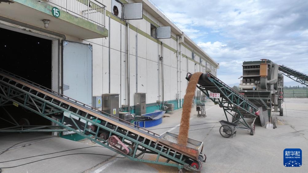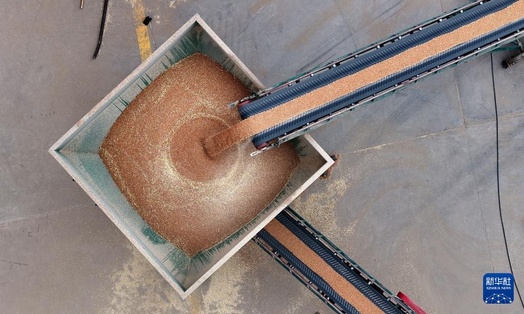 7月16日,宁夏粮食集团银川滨河储备库,自动化输送设备将小麦输送入库(无人机照片)。