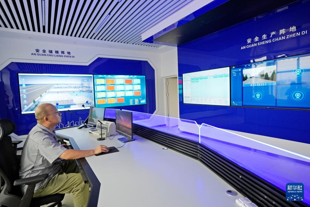 7月16日,宁夏粮食集团银川滨河储备库工作人员在智慧化控制室对收储粮食进行全程智能监控。