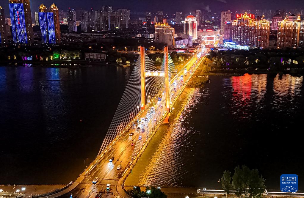 7月16日拍摄的吉林市松花江临江门大桥江段沿岸夜景(无人机照片)。