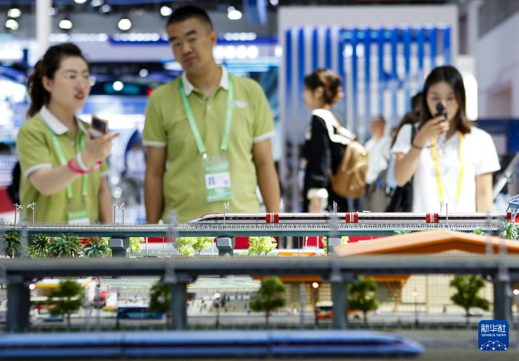 7月17日,在先进制造链展区中国中车展台,参会者观看中车高速轨道交通装备系统沙盘。