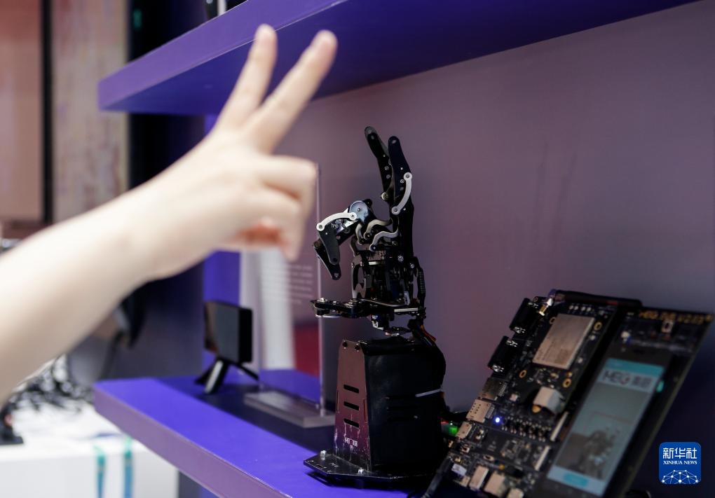 7月17日,在数字科技链展区高通展台,参会者与智能仿生手掌互动。