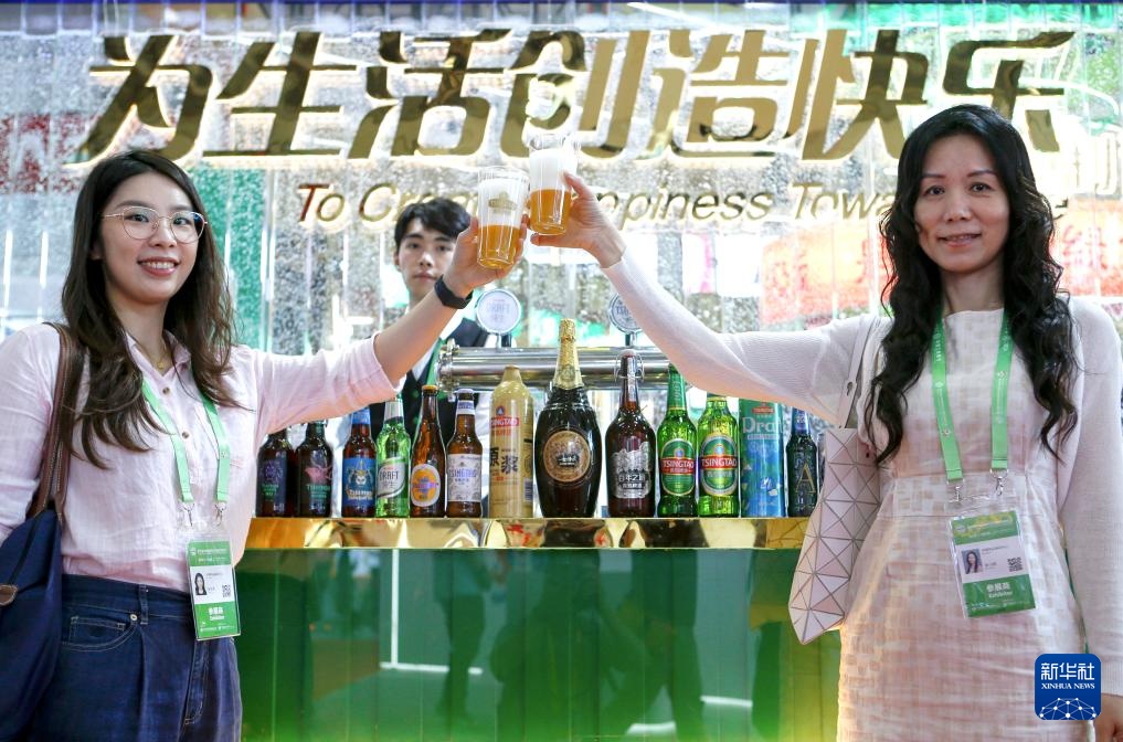 7月17日,参会者在青岛啤酒展台品尝啤酒。