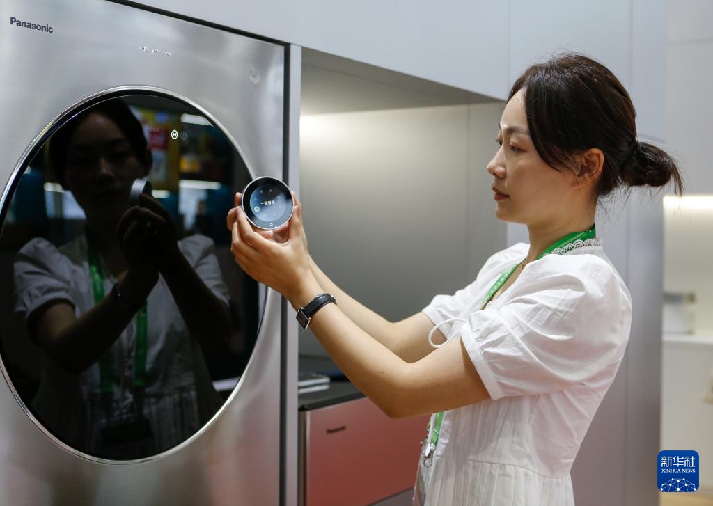 7月17日,参展商为观众介绍一款松下遥控洗衣机。