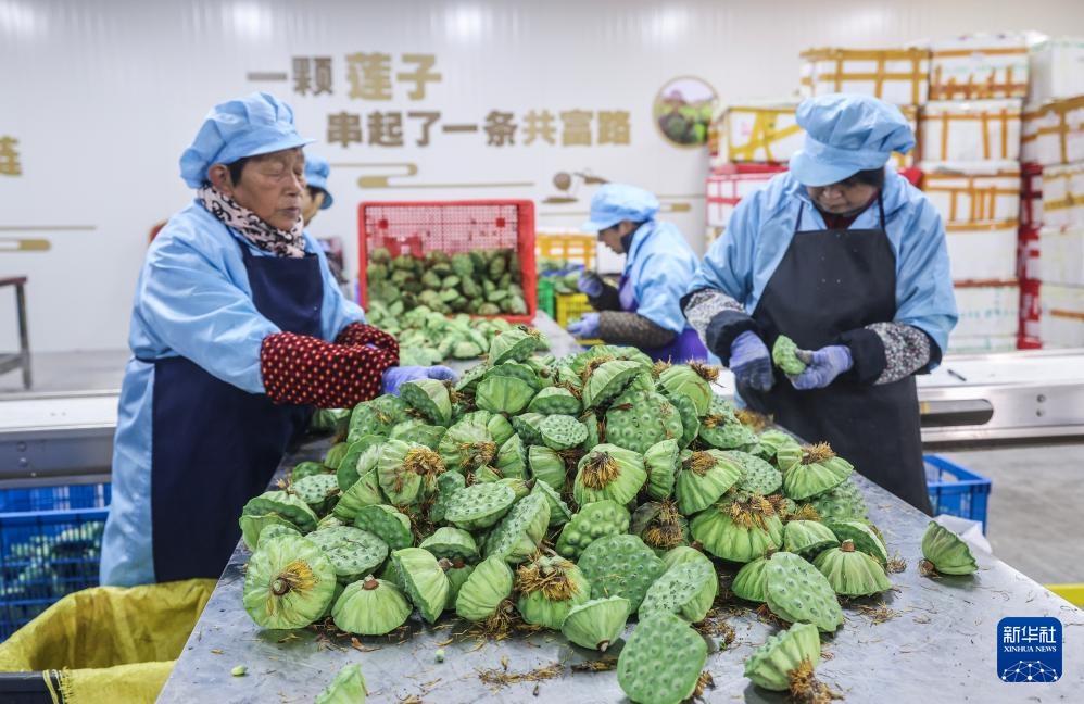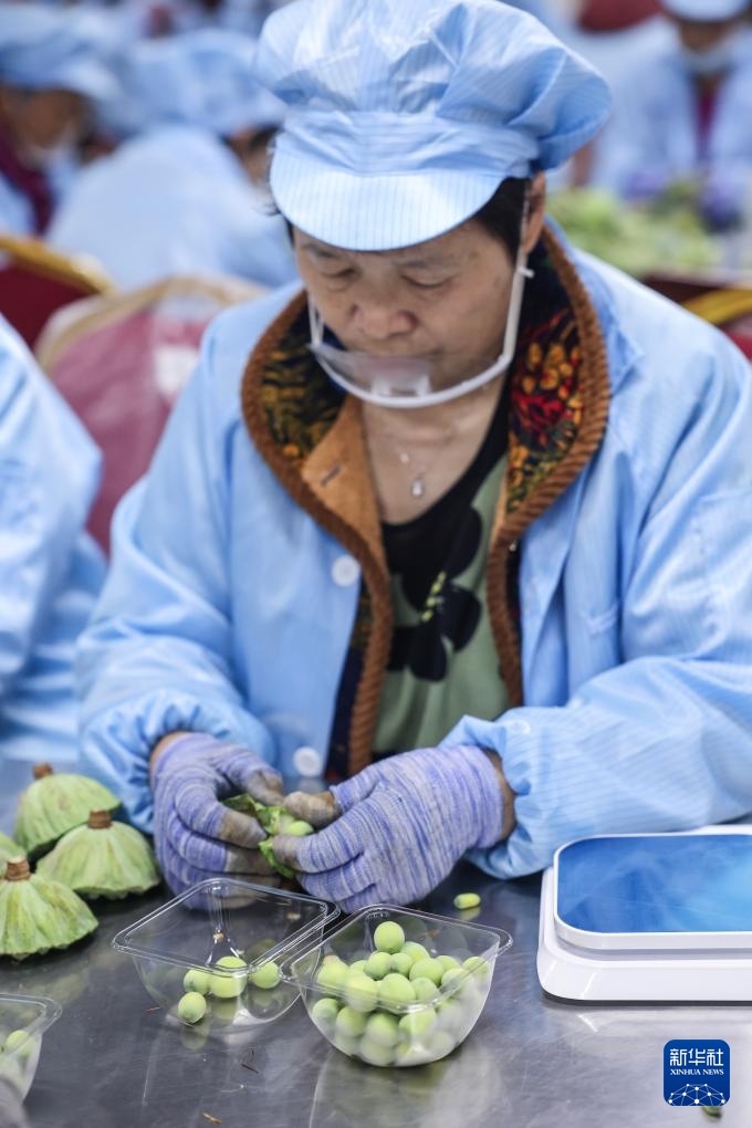 7月18日,在浙江省建德市大慈岩镇陈店村的西湖果莲共富工坊,村民在剥莲子。每年6月底到10月初,这种可直接鲜食的莲子每天有一万多盒通过电商平台的冷链物流网络送达全国各地。
