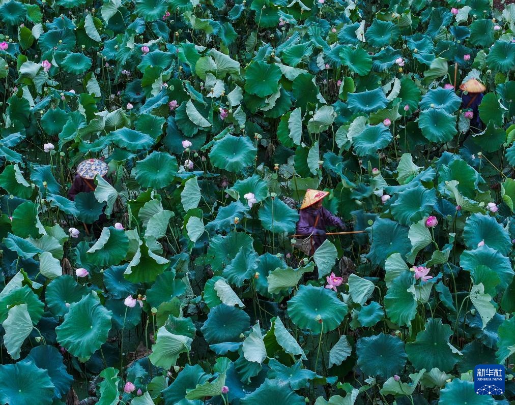 7月18日清晨,建德市大慈岩镇的果莲种植户在千亩荷塘里采摘莲蓬,经过分拣、包装后新鲜莲子当天就发往各地市场(无人机照片)。