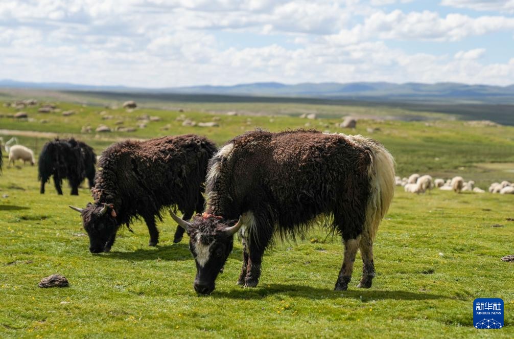 西藏聂荣嘎确生态畜牧业发展有限责任公司牧场上的牛羊(7月17日摄)。