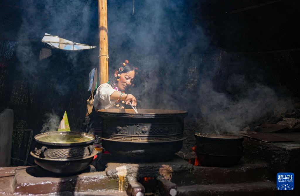 牧民在西藏聂荣嘎确生态畜牧业发展有限责任公司牧场制作奶渣(7月17日摄)。