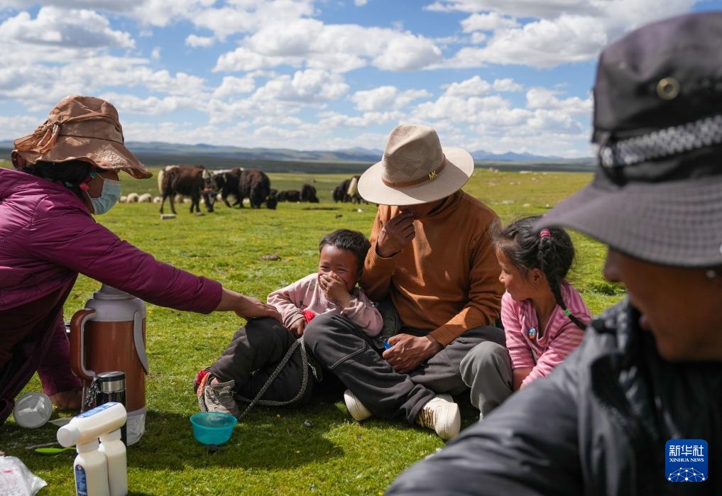 牧民员工带着家人在西藏聂荣嘎确生态畜牧业发展有限责任公司牧场放牧(7月17日摄)。