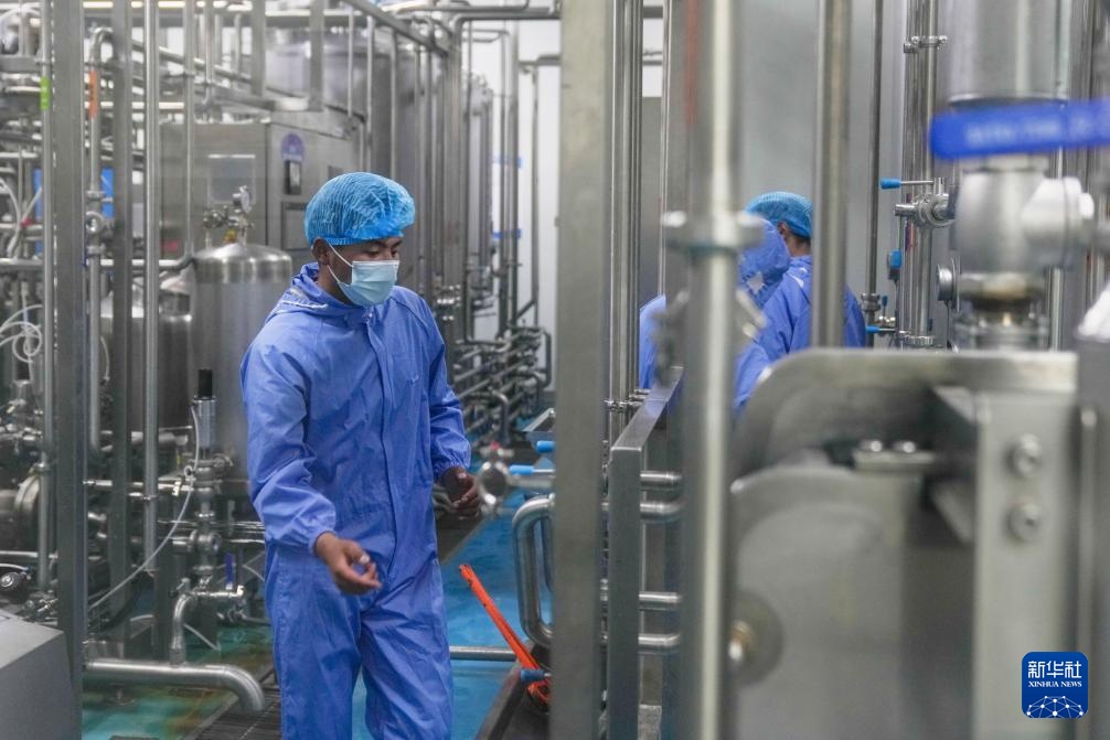 西藏聂荣嘎确生态畜牧业发展有限责任公司员工在乳制品生产线巡查设备(7月17日摄)。