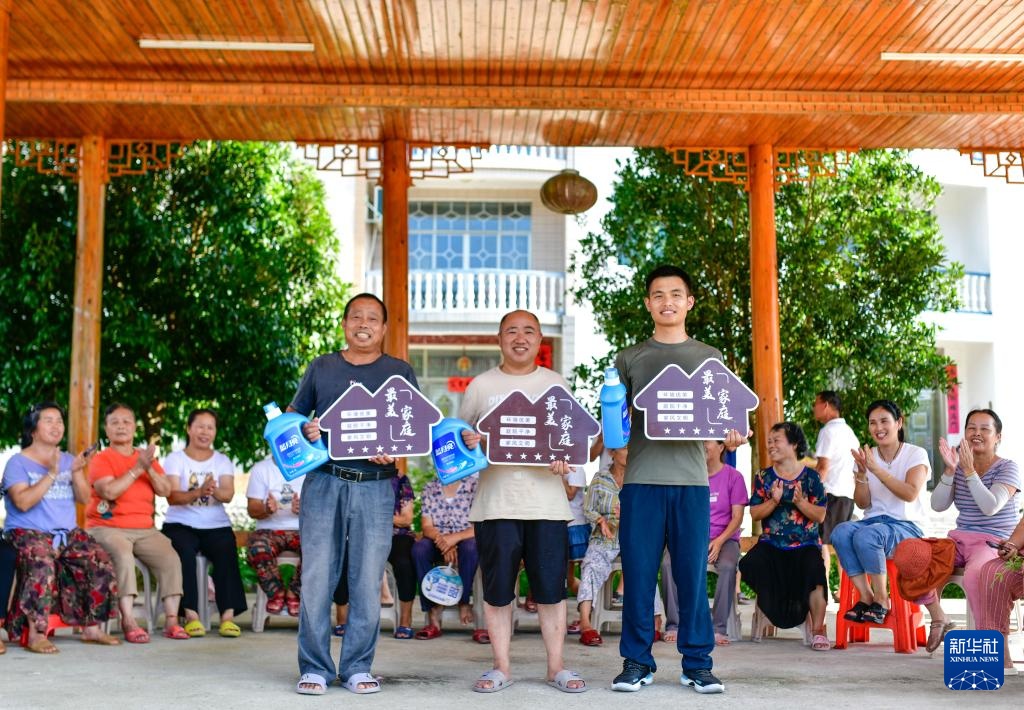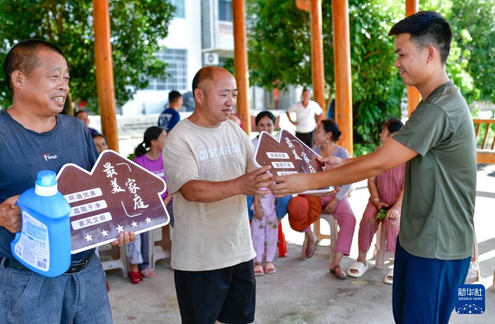 在贵州省天柱县坌处镇清华村,村干部(右一)给“最美家庭”村民代表颁发牌匾和生活用品作为奖励(7月15日摄)。