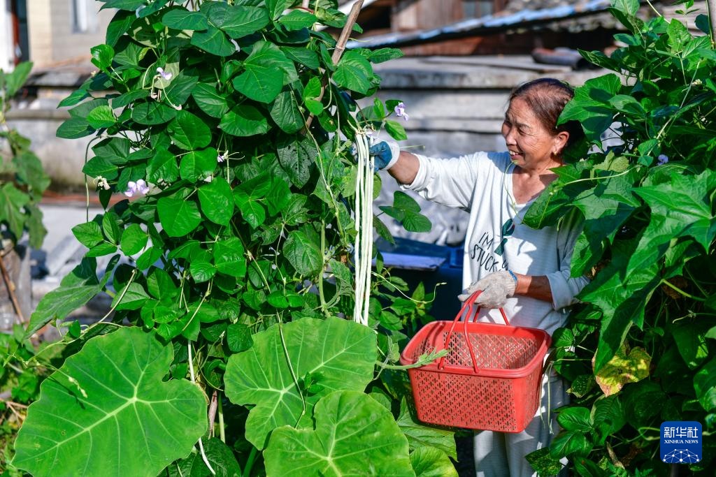 贵州省天柱县高酿镇高酿村的村民在家门前开辟的“庭院经济”菜园里采摘蔬菜(7月16日摄)。