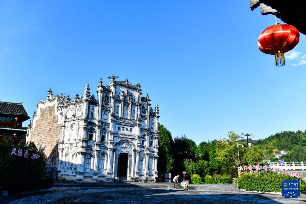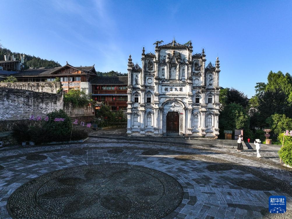 游客在贵州省天柱县坌处镇三门塘村宗祠广场留影(7月15日摄)。