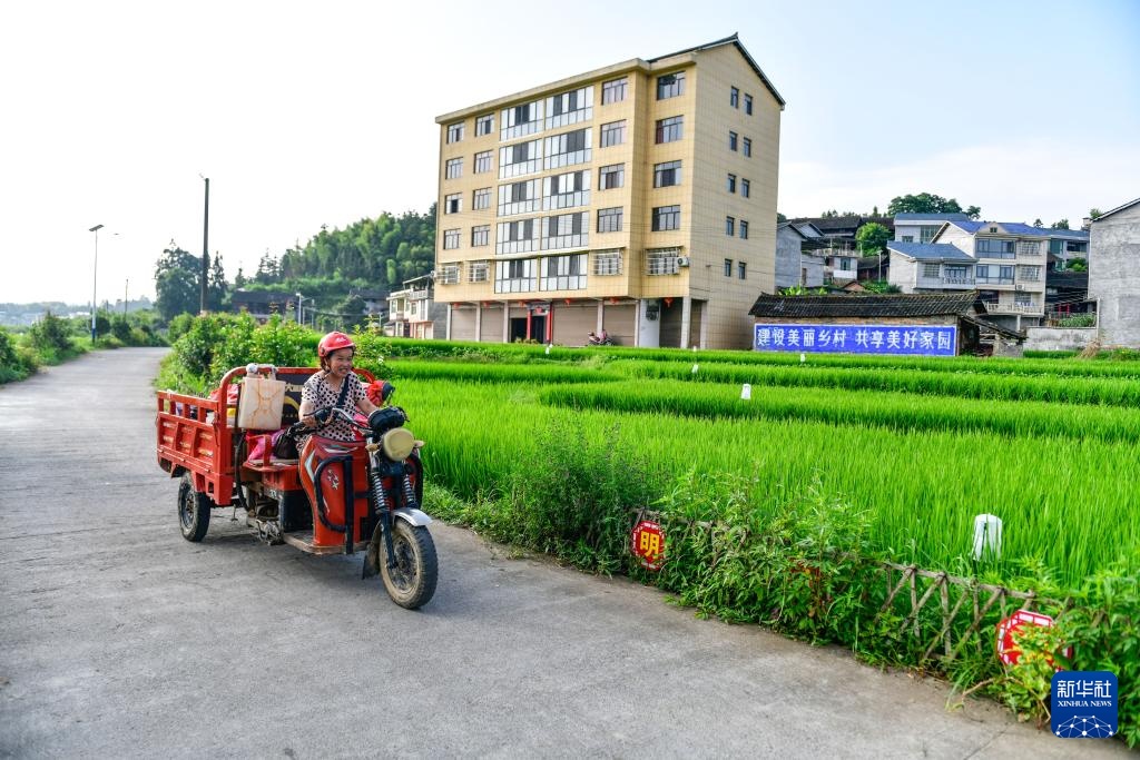 贵州省天柱县高酿镇高酿村的村民驾驶农用车从干净的通村公路上驶过(7月16日摄)。