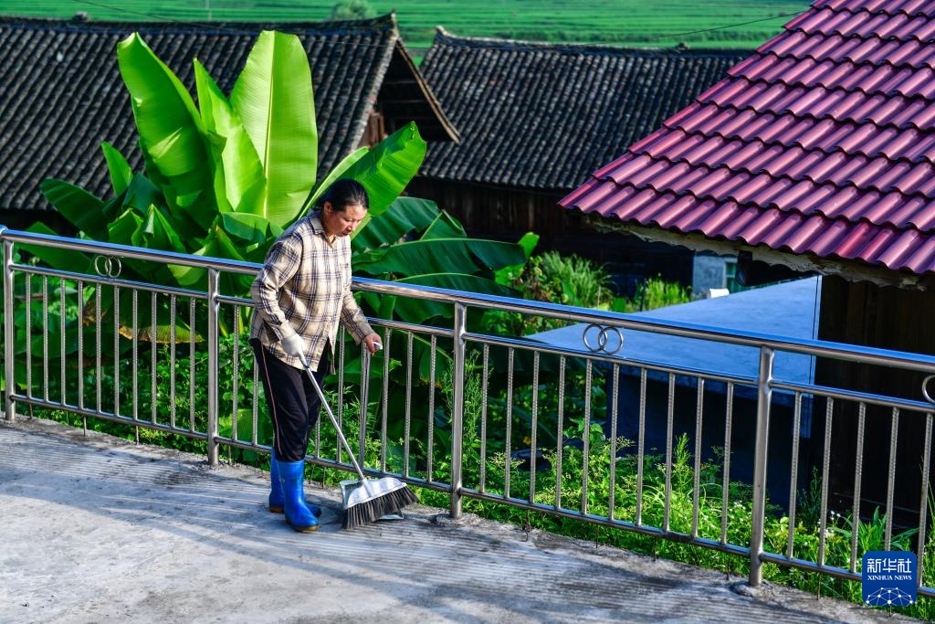贵州省天柱县高酿镇高酿村的村民在打扫庭院卫生(7月16日摄)。
