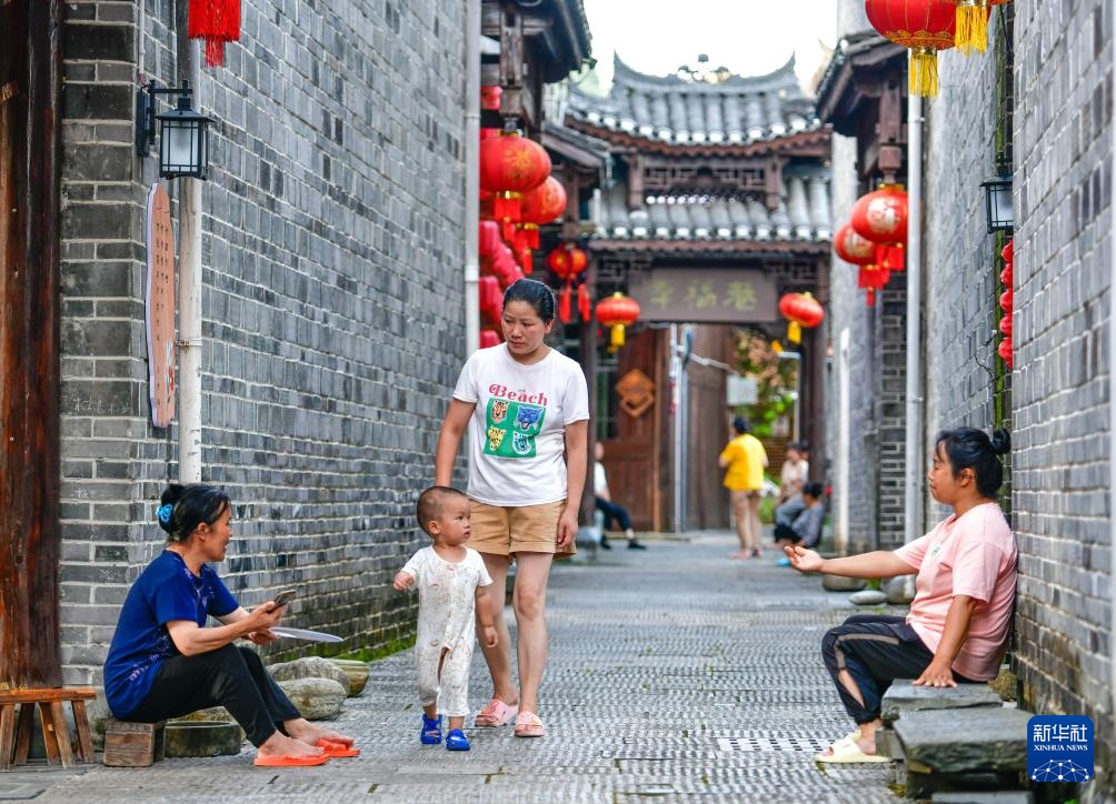贵州省天柱县坌处镇三门塘村的村民在干净整洁的古巷里纳凉(7月15日摄)。