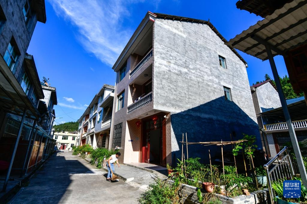 贵州省天柱县坌处镇清华村的村民在打扫房前屋后卫生(7月15日摄)。