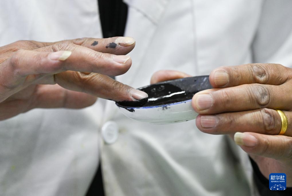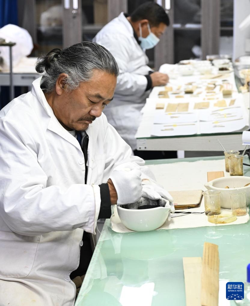 布达拉宫贝叶经实验性修复小组实验室工作人员对用于贝叶修复的颜料进行研磨处理(5月25日摄)。