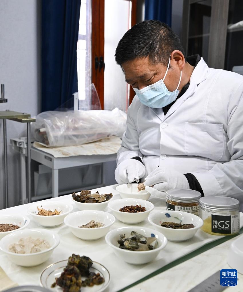 布达拉宫贝叶经实验性修复小组实验室工作人员对用于贝叶修复的粘合剂原料进行加工(5月25日摄)。