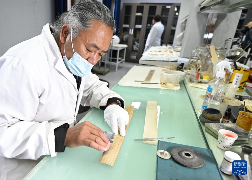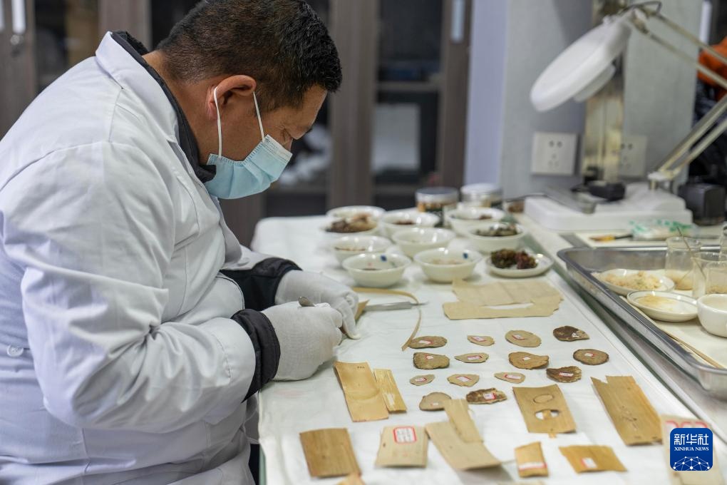 布达拉宫贝叶经实验性修复小组实验室工作人员对贝叶进行处理(5月25日摄)。